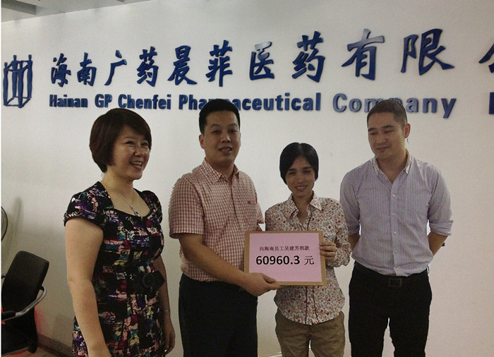 向成員企業(yè)員工吳建芳(右二)送上祝福與廣州醫(yī)藥的愛心捐款